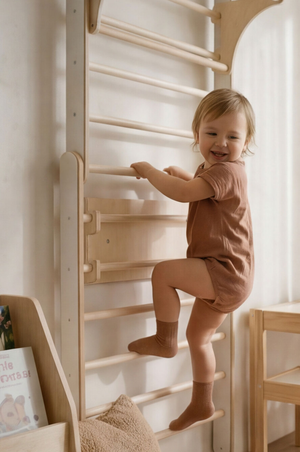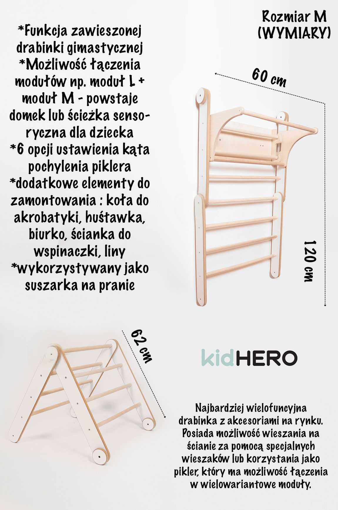 Przygotujcie małe nóżki swoich pociech do wspinaczki, a ich kochane rączki do chwytania, ponieważ mamy super zabawkę, która jest idealna dla Waszych młodych mistrzów wspinaczki. Przywitaj się z drabinką gimnastyczną z drążkiem do wspinania – składanym piklerem do wspinaczki zaprojektowanym zgodnie z filozofią pedagogiki Montessori. Jest to pomoc edukacyjna, która istnieje od prawie wieku, wynaleziona przez genialnego węgierskiego pediatrę o imieniu Emmi P. która wielokrotnie udowadniała, że jest to narzędzie wspierające rozwój dziecka. Pomaga w rozwijaniu równowagi, motoryki i koordynacji ruchowej, a jednocześnie inspiruje do twórczego myślenia i kreatywności. Bo kto potrzebuje trenera wspinaczki, kiedy ma się drabinkę gimnastyczną kidHERO, prawda?