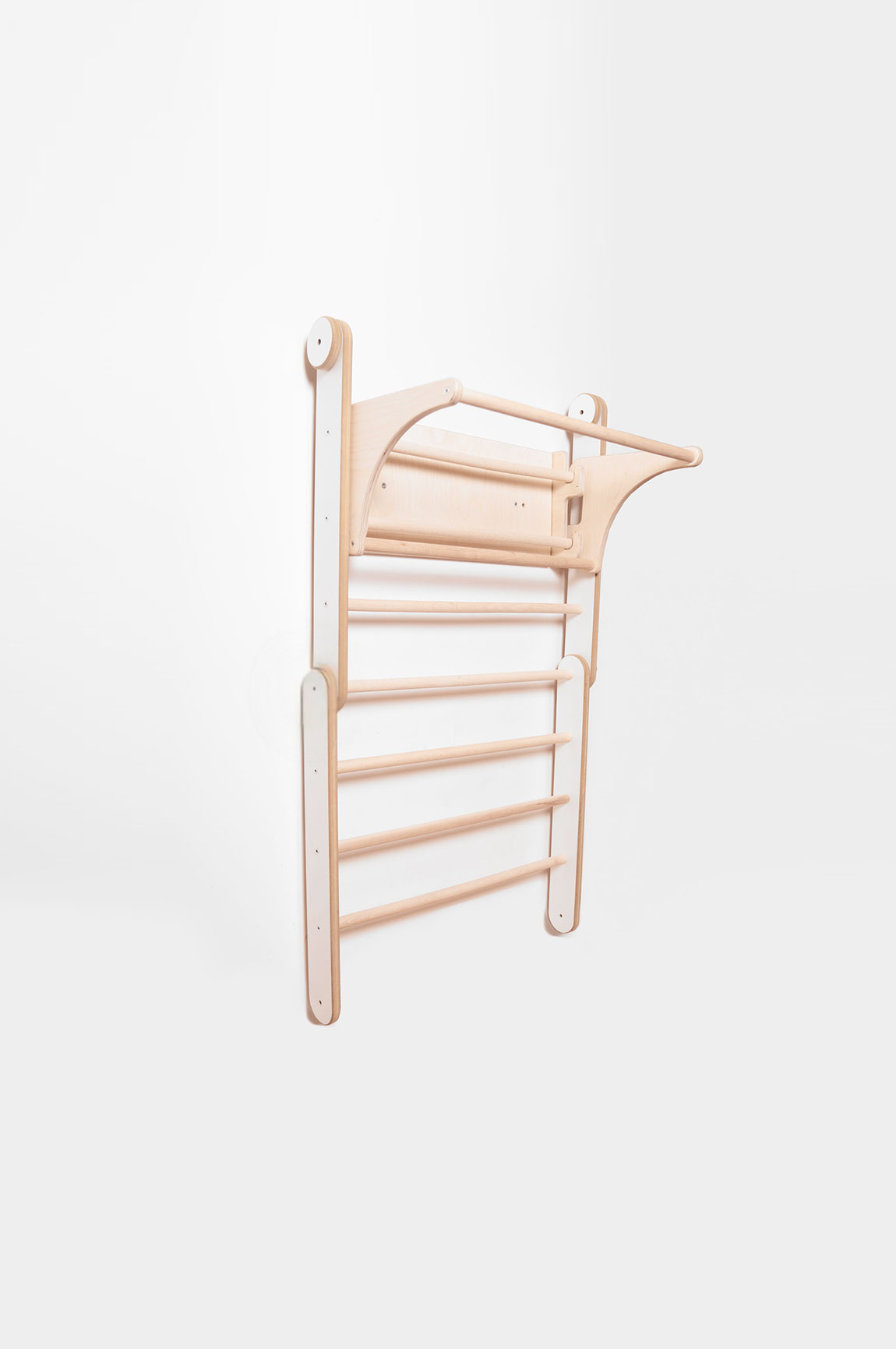 -DRABINKA GIMNASTYCZNA rozmiar M – można ją zawiesić na ścianie za pomocą wieszaka montowanego do ściany za pomocą kołków – montaż jest bardzo prosty. W alternatywnej opcji drabinka może zostać złożona w trójkąt pilkera i stać na podłodze jako produkt do zabawy i wspinania się – można używać jej razem z bujakiem i ścianką dzięki czemu możemy stworzyć domowy plac zabaw dla naszych pociech.