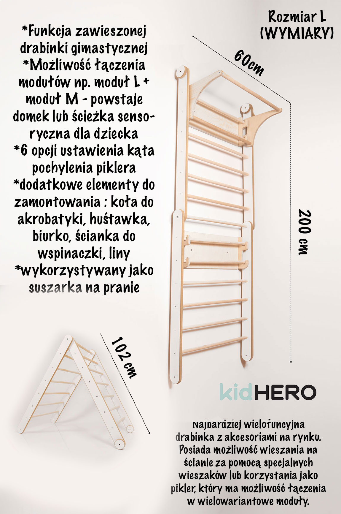 | Wysokość | 200 cm jako drabinka / 100 cm jako pikler |
