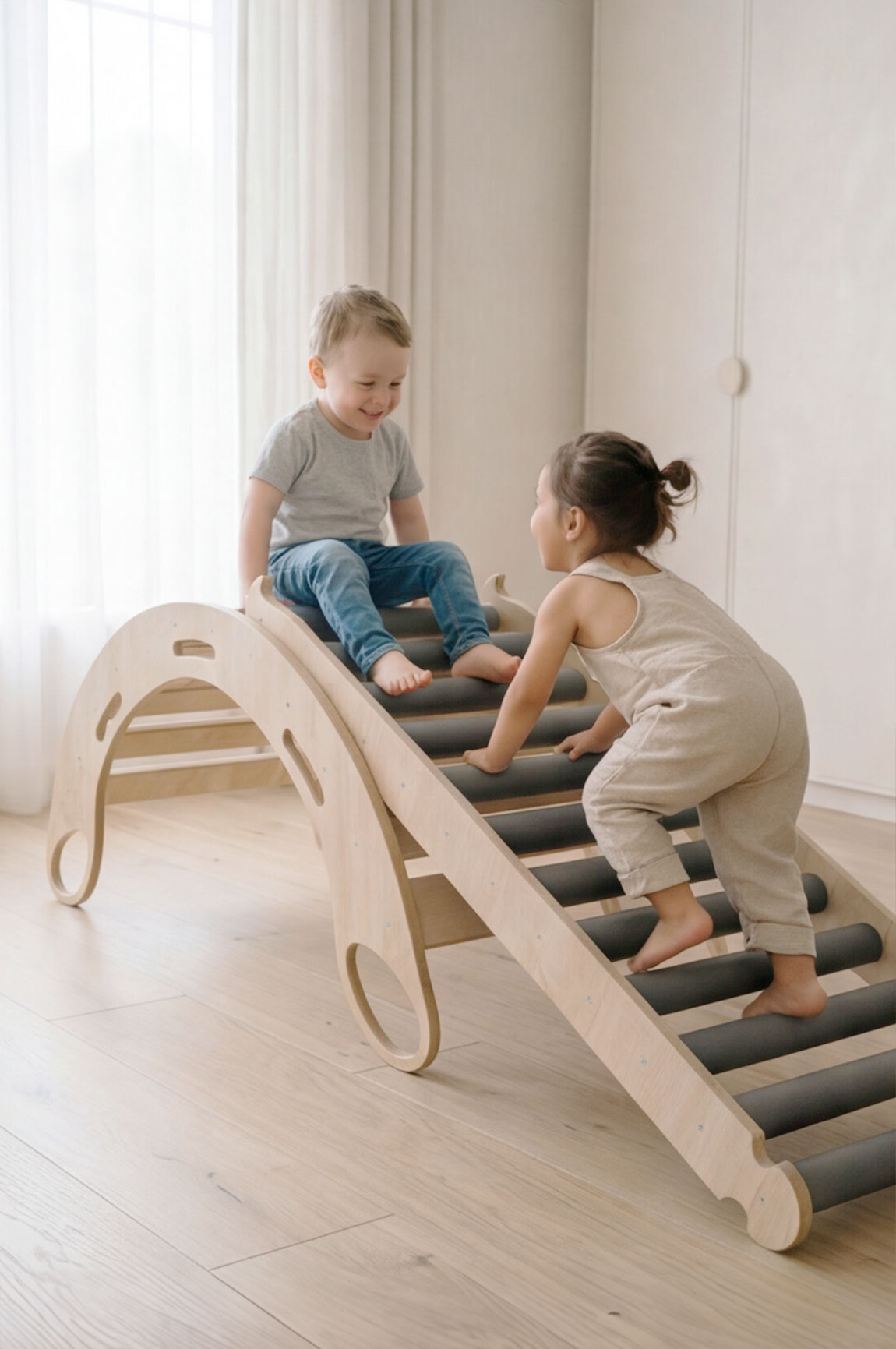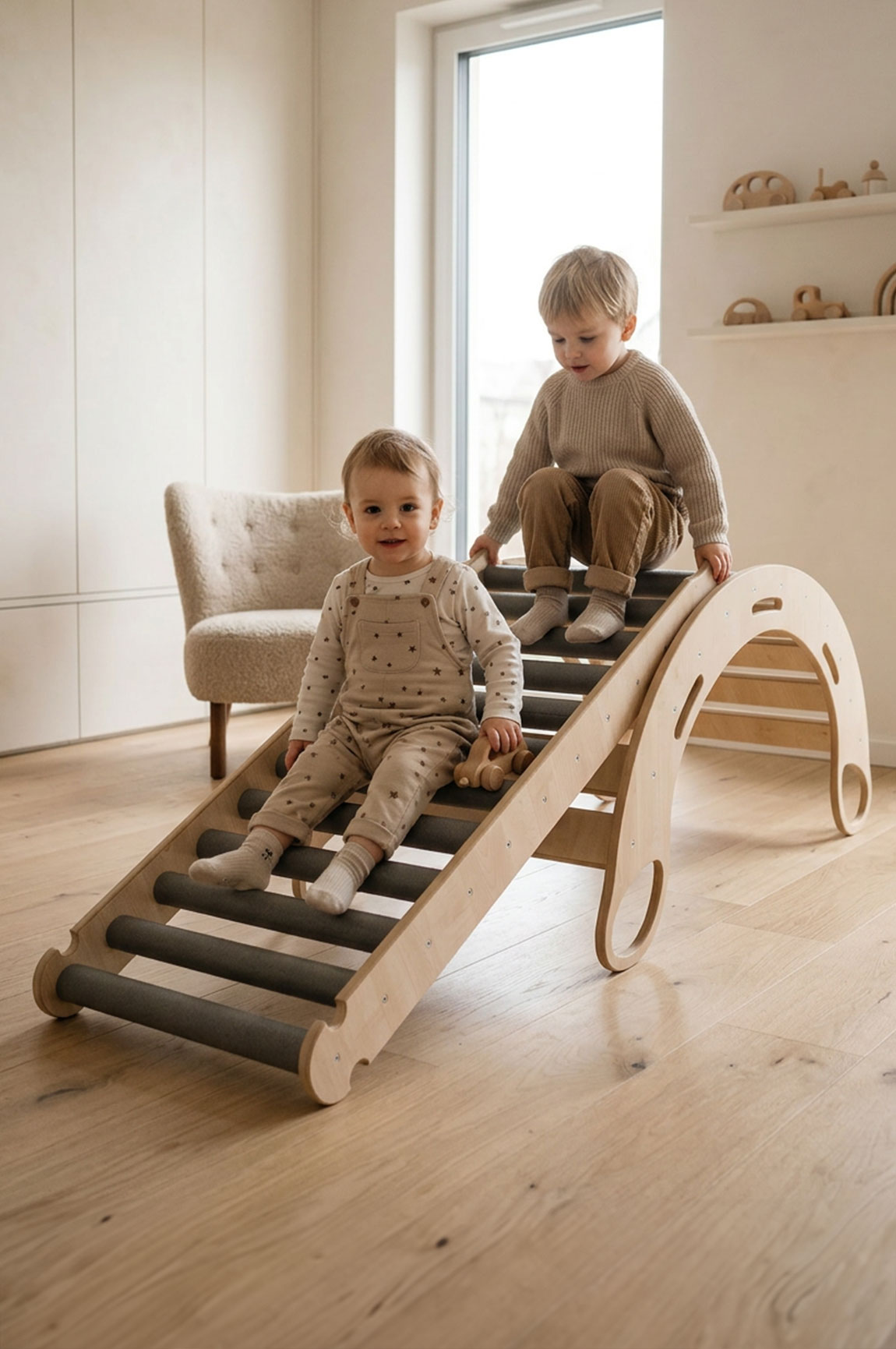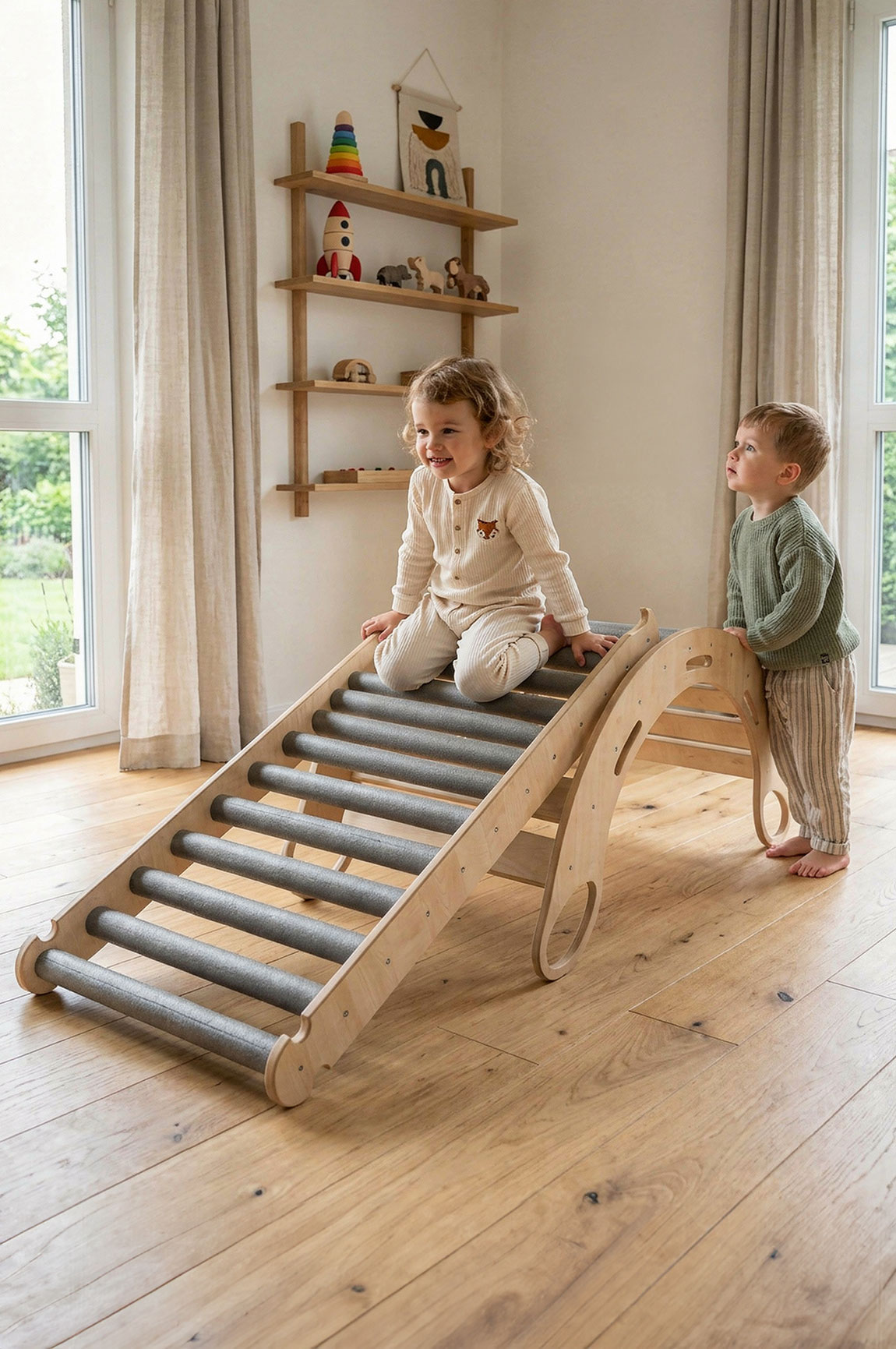 Po połączeniu zjeżdżalni rolkowej z bujakiem Twoje dziecko zyskuje domową przestrzeń do wspinania, balansowania, przechodzenia i zjeżdżania. To zestaw, który nie tylko daje ogromną radość, ale także wspiera rozwój motoryczny, sensoryczny i koordynacyjny już od najmłodszych lat.