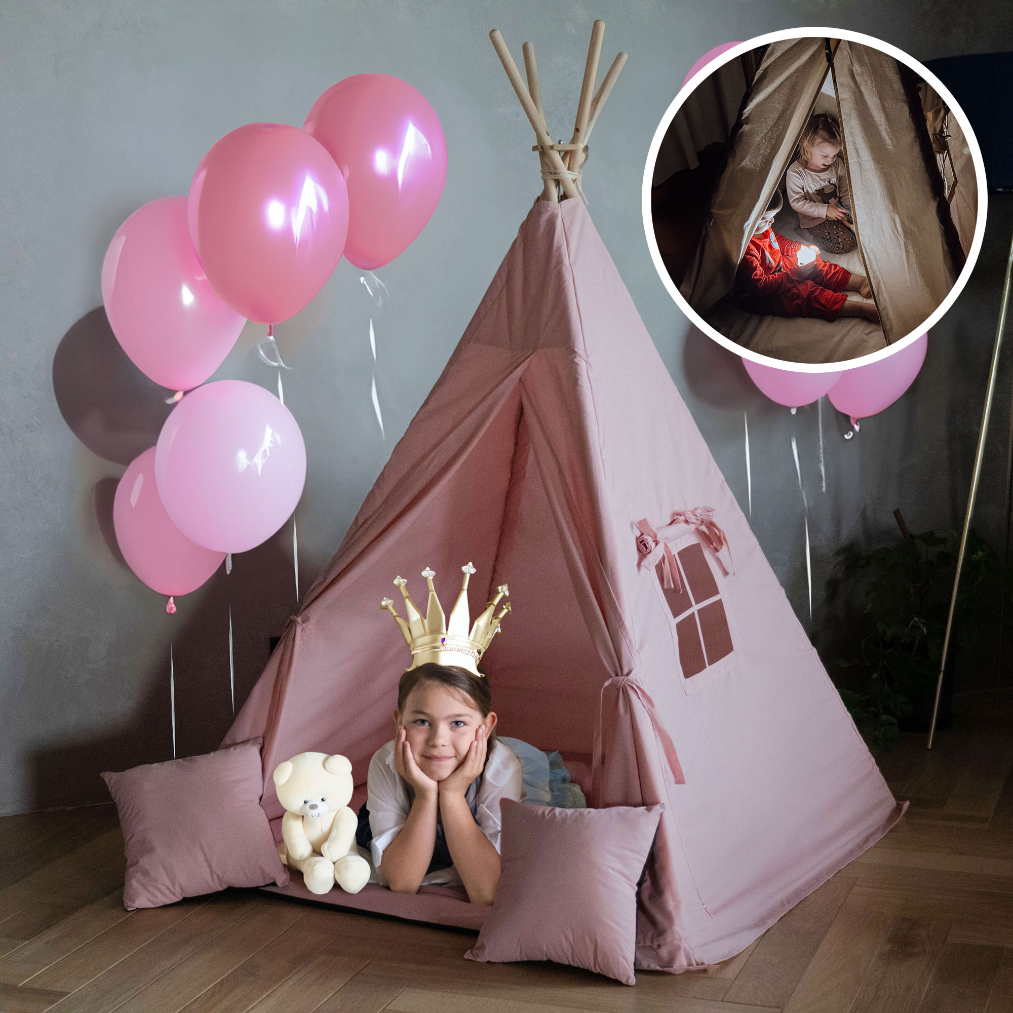 Namiot TIPI domek (teepee) Zestaw 6 elementowy dla dzieci z poduszkami, stabilizatorem i lampką – Brudny róż